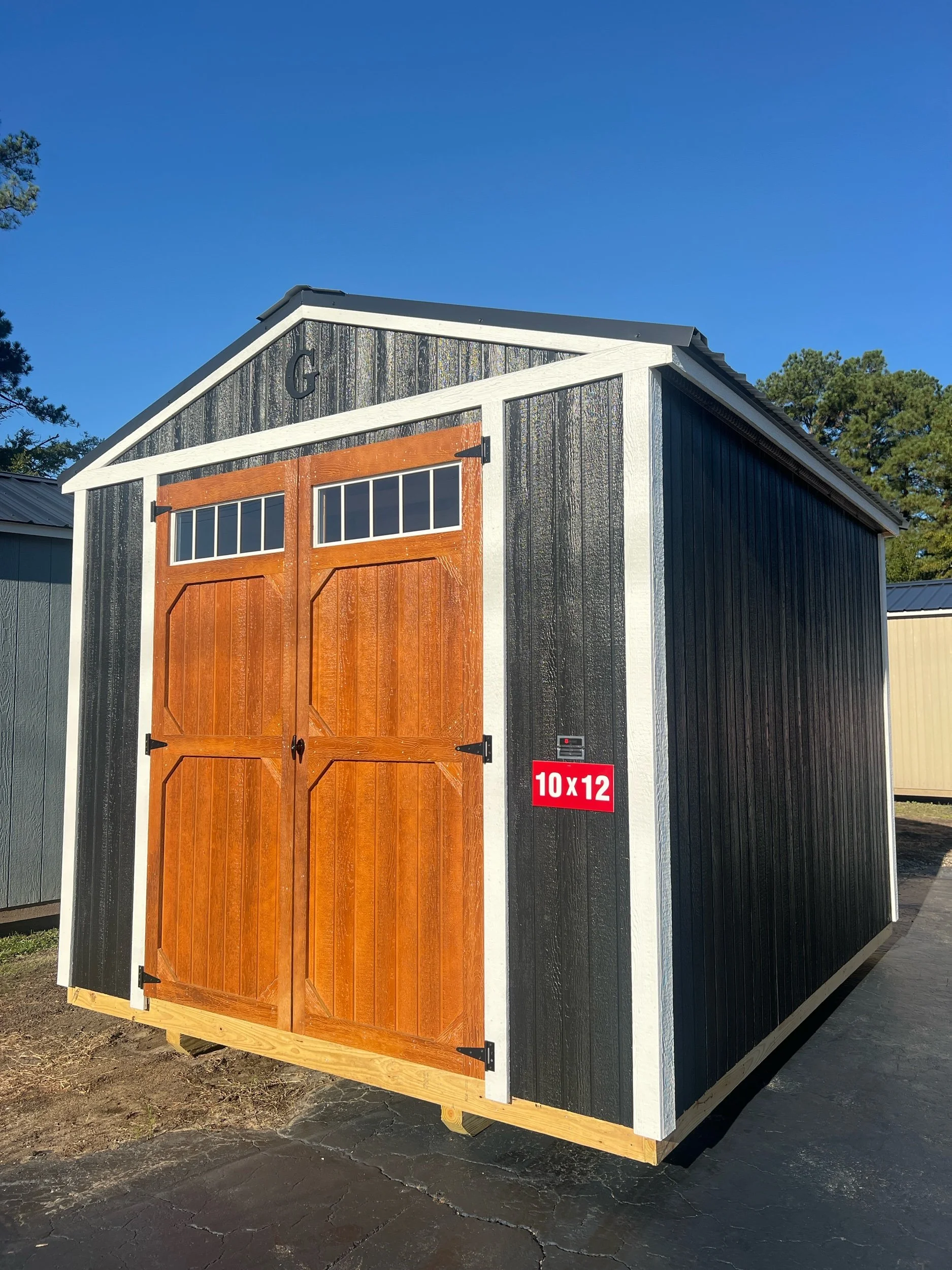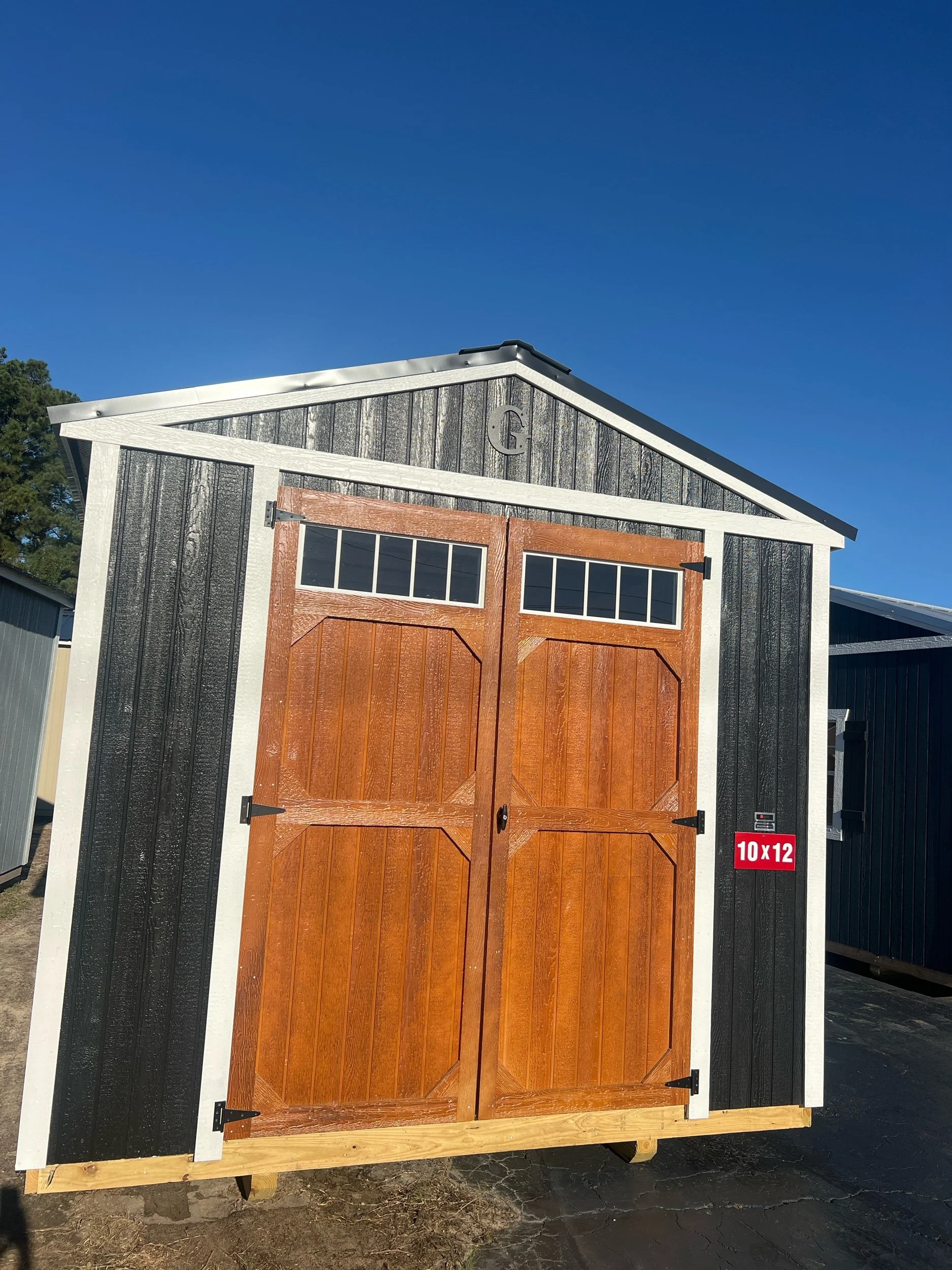 Description: Zone: 5 - Type: UX - Subtype: Standard Build - Size: 10x12 - Siding: Paint, Midnight - Siding Type: DuraTemp - Trim: Pearl - Roof: Metal, Onyx - Flooring: TreatedPlywood - Floor Stud Spacing: 16\