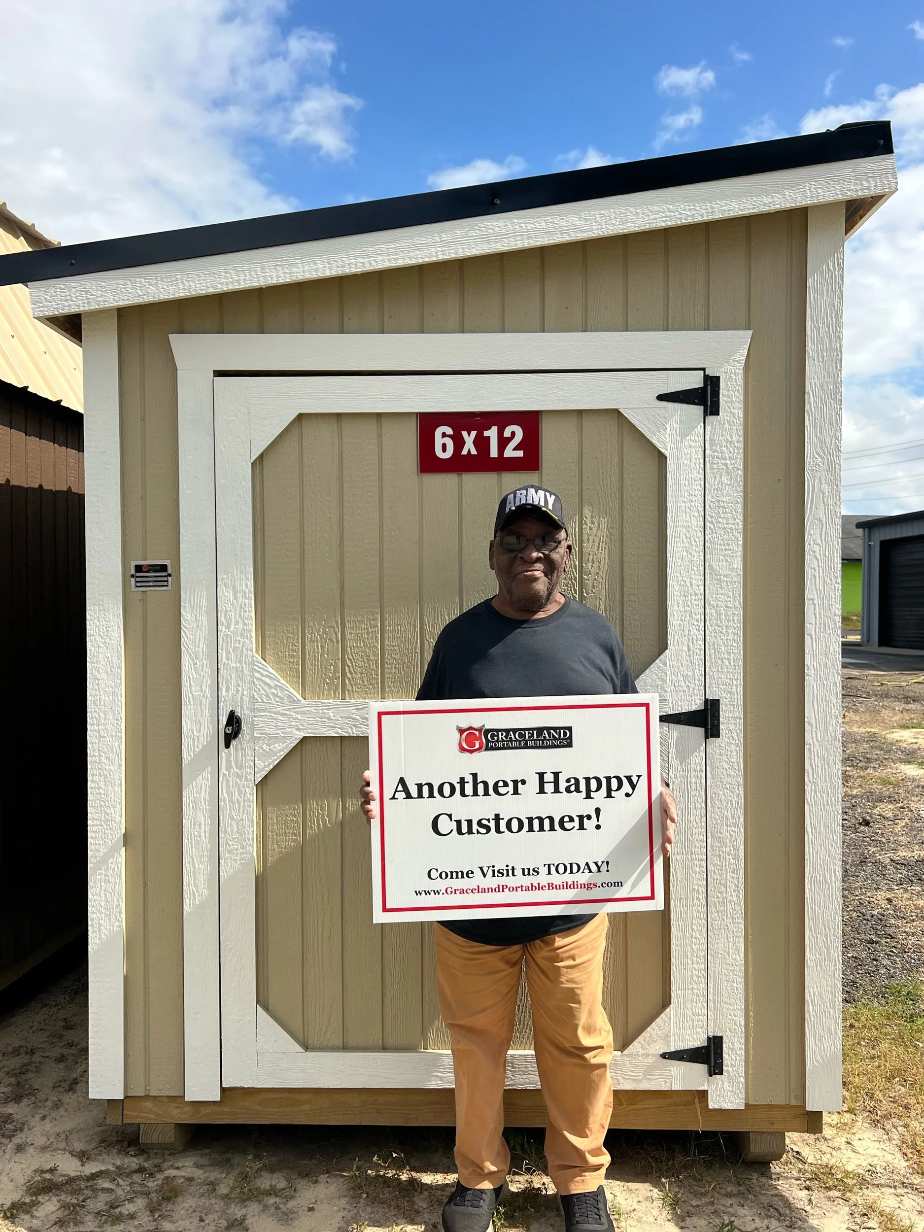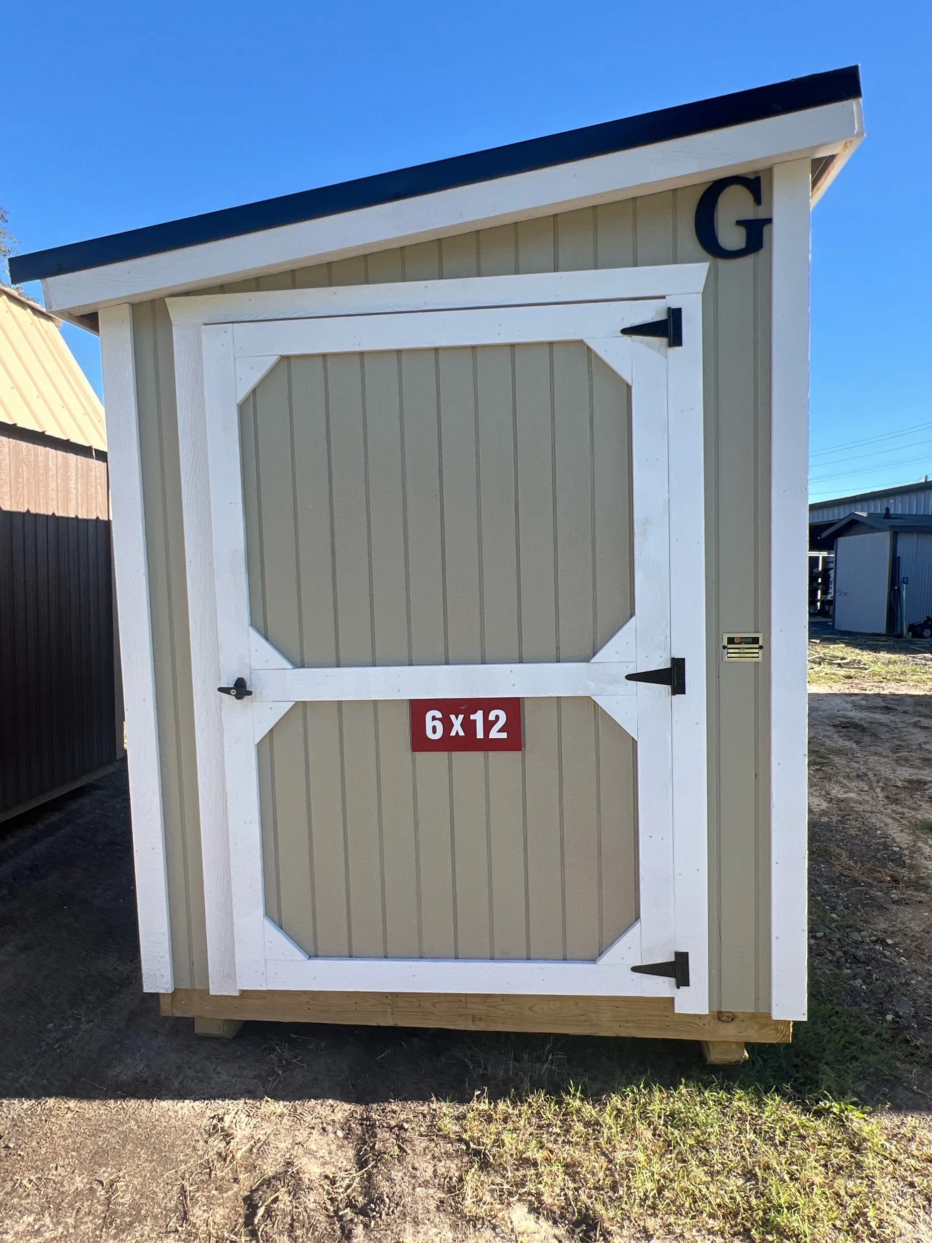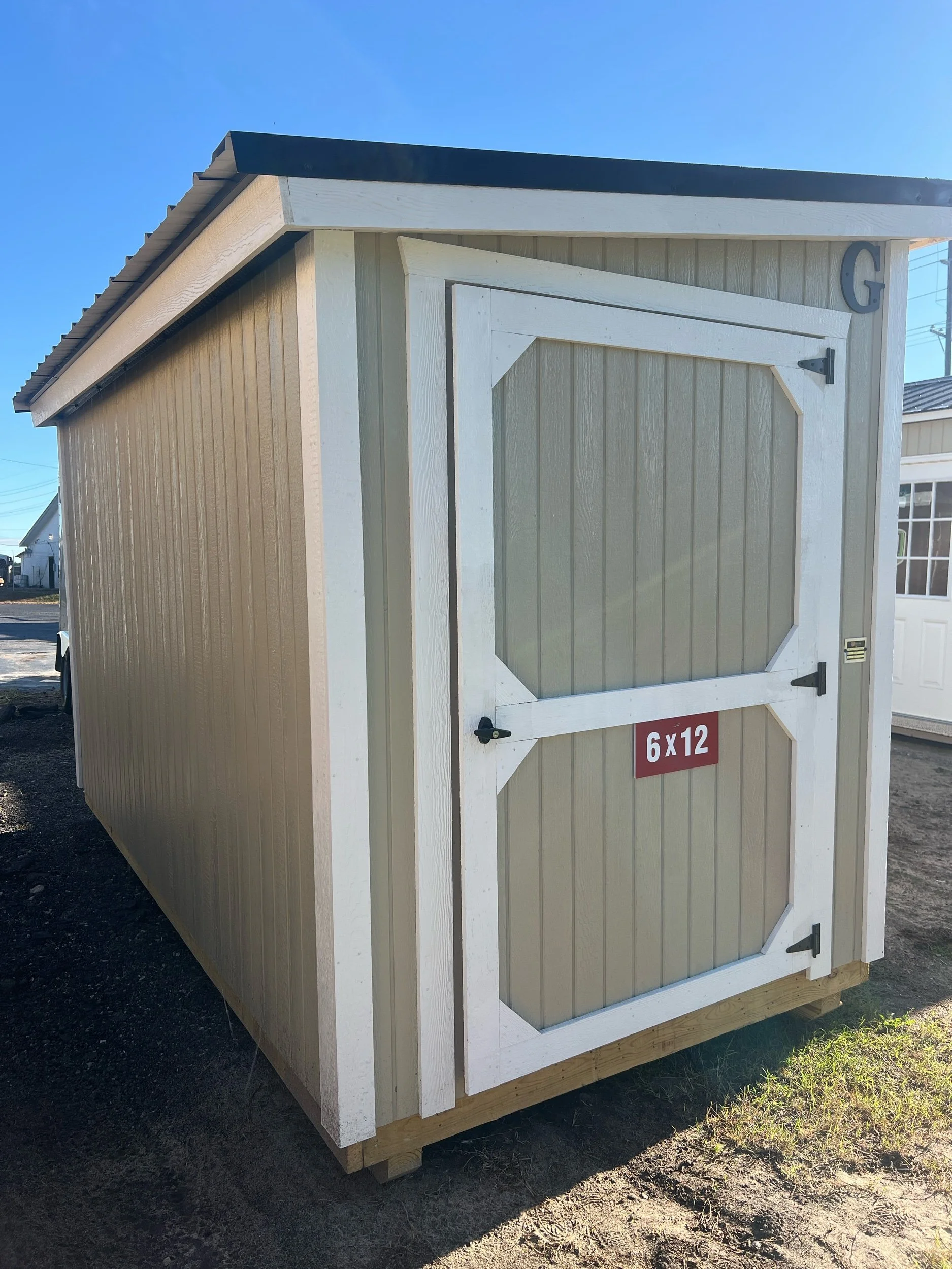 Description: Zone: 5 - Type: MS - Subtype: Standard Build - Size: 06x12 - Siding: Paint, Light Khaki - Siding Type: DuraTemp - Trim: Pearl - Roof: Metal, Onyx - Flooring: TreatedPlywood - Floor Stud Spacing: 16\