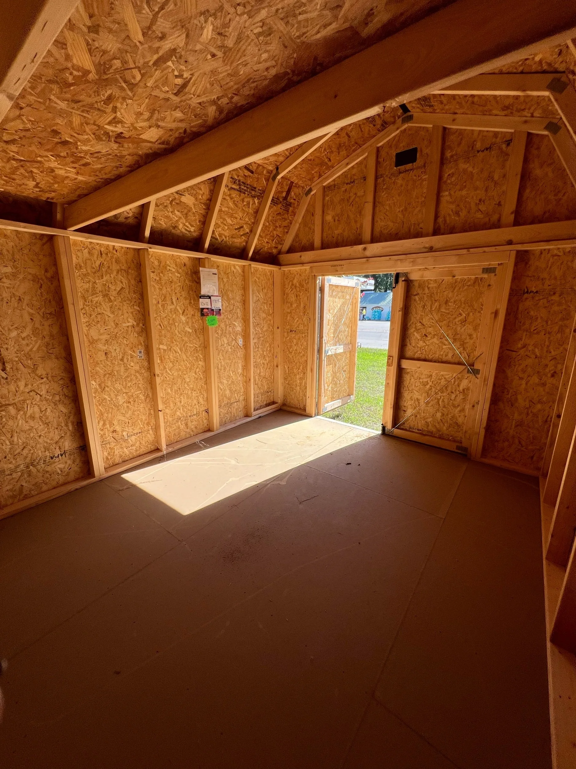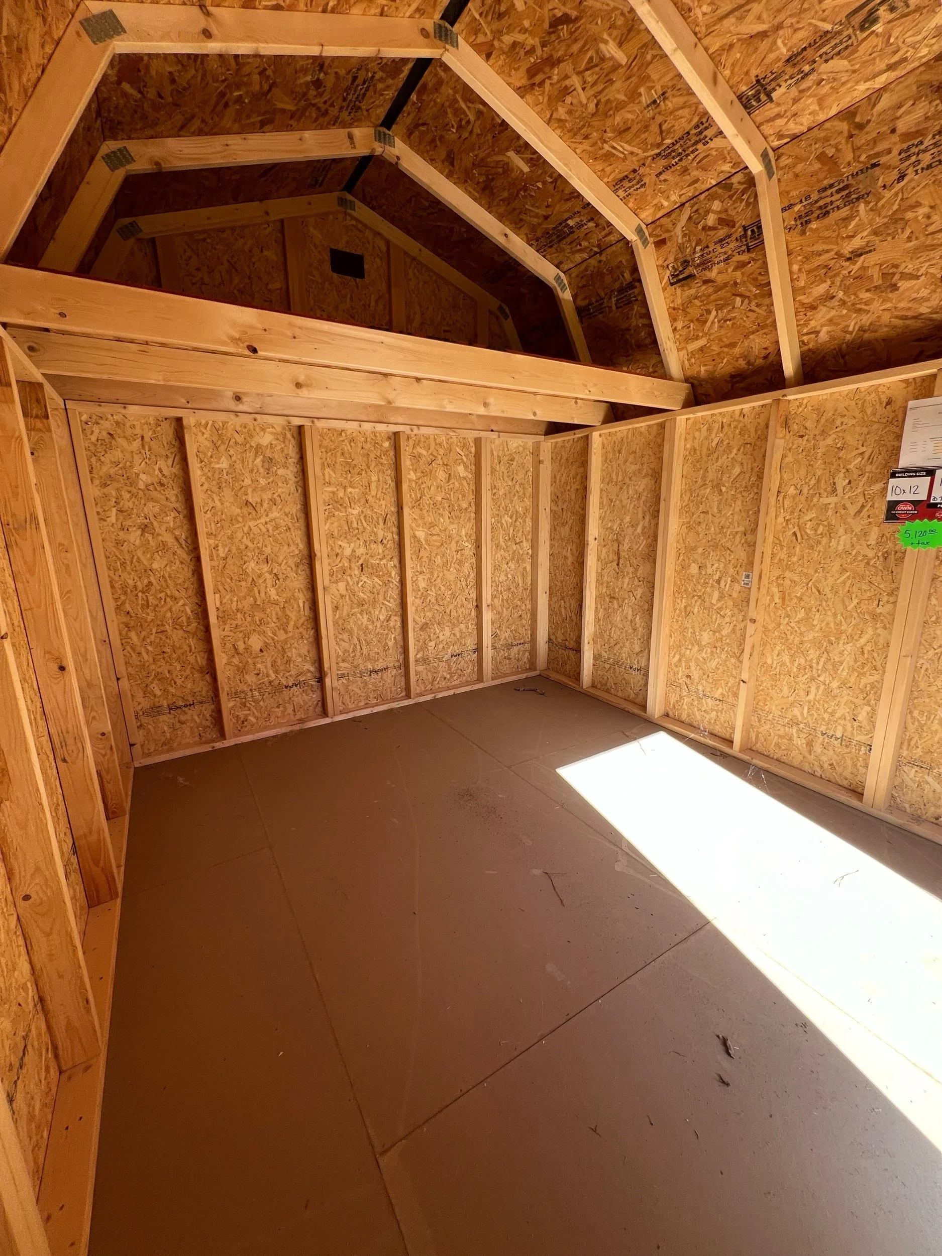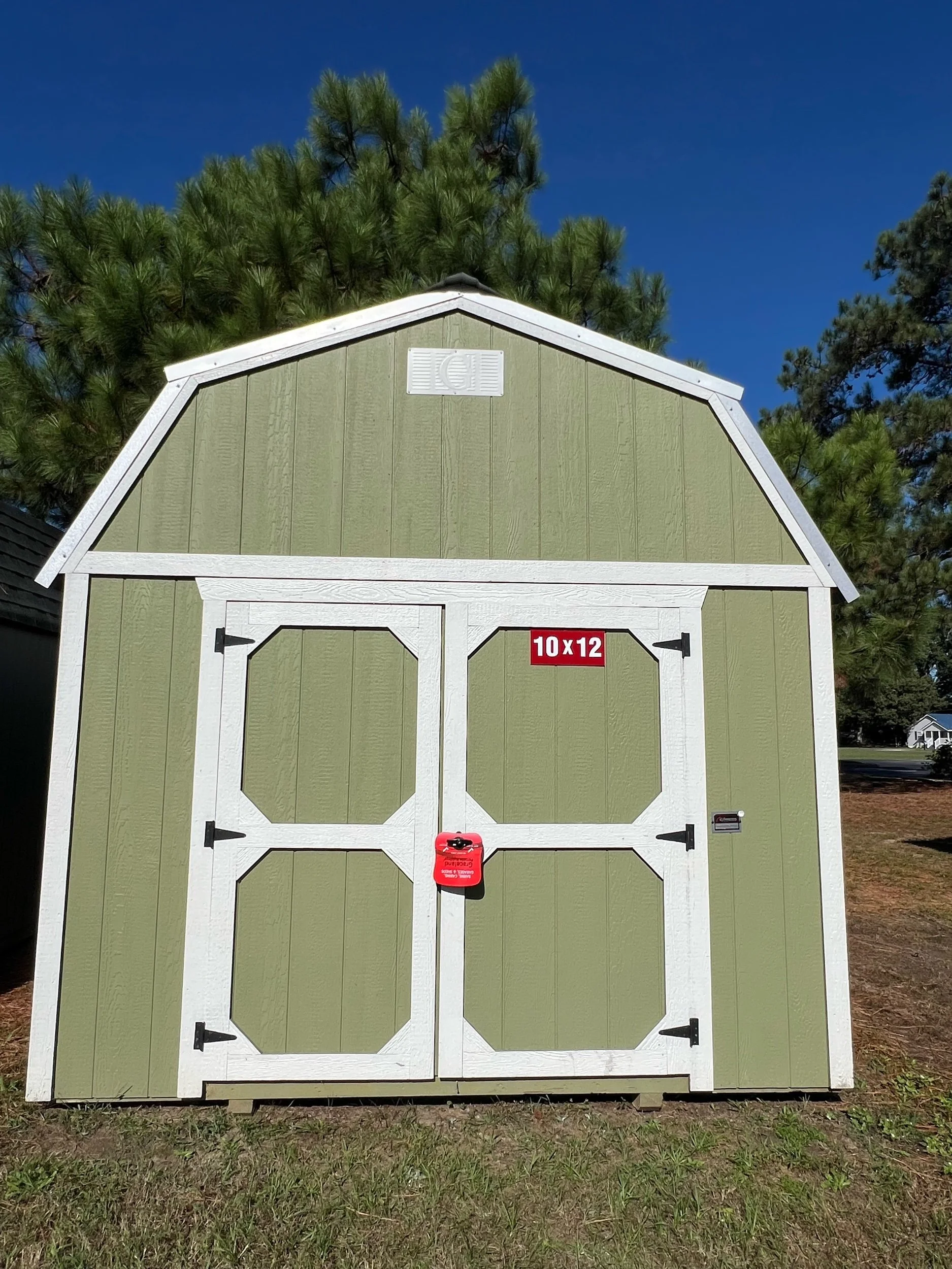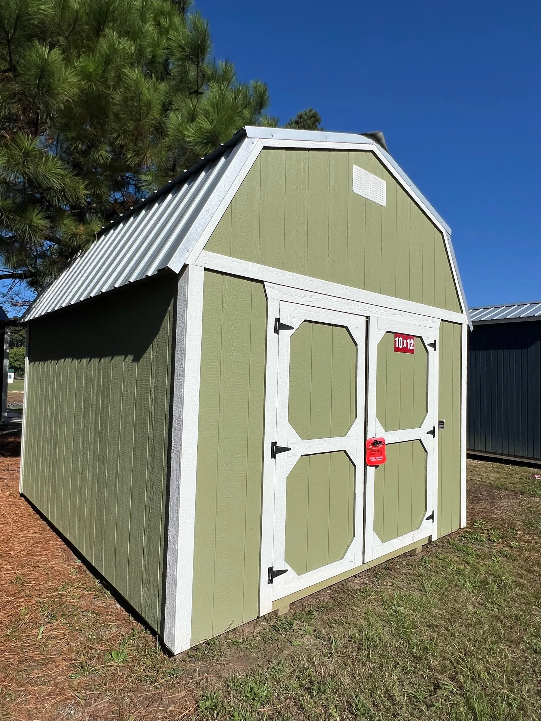 Description: 10x12 Lofted Barn. Galvalume metal roof. 1 double wood door. Olive paint w/ Pearl paint trim. Smart Floor.